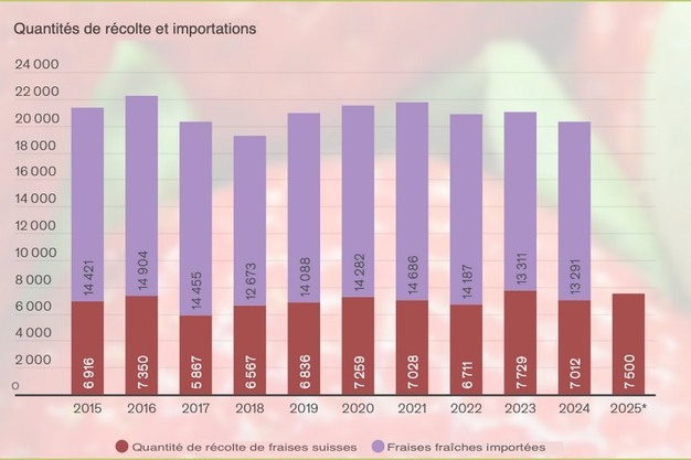 Durant la période principale de récolte, de la mi-mai à la mi-juin, les producteurs et productrices suisses récoltent chaque semaine entre 900 et 1 100 tonnes de fraises. Cette année, Fruit-Union Suisse prévoit une abondante récolte, estimée à environ 7 500 tonnes.