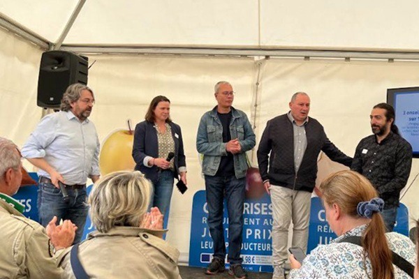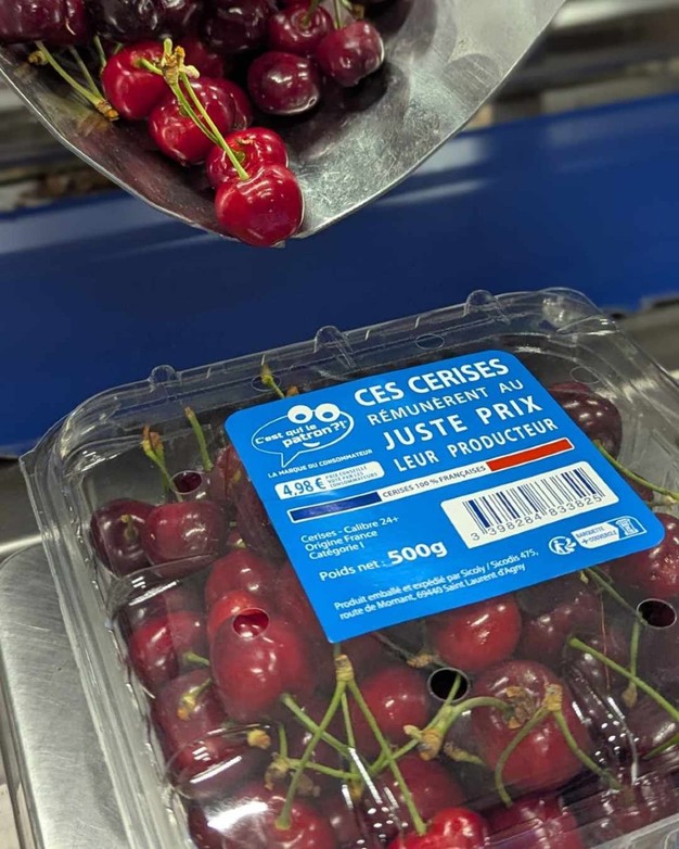 © CQLP?!Mercredi 3 juin à Lyon s'est déroulé le lancement officiel des fruits et légumes solidaires. Fin 2024 CQLP ?! avait annoncé que la grande famille des fruits et légumes allait rejoindre la démarche. Et c'est la cerise qui a ouvert le bal (pommes, carottes et oignons seront également lancés cette année). La nouvelle cerise solidaire permettra ainsi « d'aider pas moins de 116 familles d'arboriculteurs des Coteaux et Monts du Lyonnais, confrontées à une filière en crise : prix instables, mauvaise valorisation des cerises de taille moyenne, et -36 % de producteurs en 10 ans ». L'ensemble des cerises CQLP ?! proviendront de la coopérative Sicoly. Producteurs, consommateurs et représentant magasins étaient présents pour le lancement qui s'est déroulé dans l'exploitation d'un des producteurs de la coopérative. Les cerises solidaires estampillées CQLP ?! seront disponibles en rayon en fin de cette semaine chez Auchan (surtout dans l'Est), Leclerc (dans l'Est et dans le Sud) ainsi que dans les magasins U partout dans le Sud de la France.
