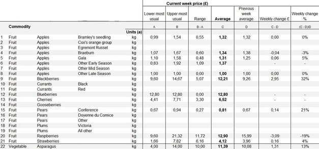 A l'inverse, les framboises ont connu une baisse de leur prix moyen entre la semaine dernière et cette semaine. Le prix moyen de la semaine précédente était nettement plus élevé, à 15,99 £ par kg, alors que la moyenne actuelle est tombée à 12,90 £ par kg. Cette baisse indique un changement dans les tendances de prix, peut-être lié à des variations dans l'offre, à des influences climatiques ou à des changements dans les préférences du marché. En revanche, les asperges ont vu leur prix moyen augmenter, passant de 10,08 £/kg la semaine précédente à 11,39 £/kg cette semaine.