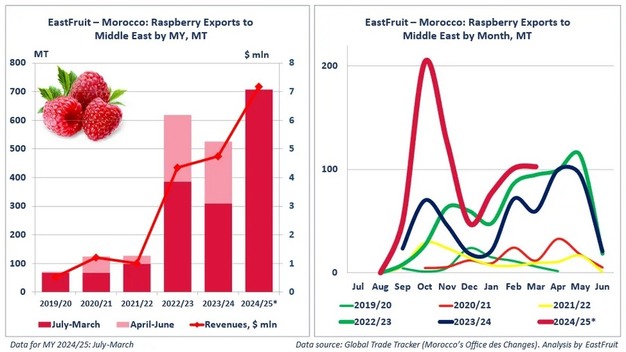 Les exportations de framboises fraîches marocaines vers les pays du Moyen-Orient ont dépassé 700 tonnes métriques au cours des neuf premiers mois de la campagne de commercialisation 2024/25. Ce volume dépasse non seulement les exportations des campagnes 2022/23 et 2023/24, mais établit également un nouveau record pour la région.