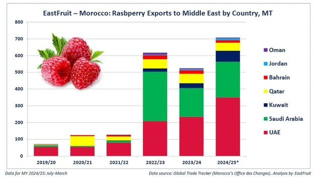 Si le Moyen-Orient n'est pas encore la principale destination des exportations marocaines de framboises, il présente un fort potentiel de croissance. Au cours de l'année fiscale 2019/20, la région ne représentait que 0,23% des exportations totales de framboises du Maroc. En 2022/23 et 2023/24, cette part était passée à 1,05 % et 0,93 %, respectivement. Au cours de l'actuel MY 2024/25, cette part a déjà dépassé 1,5 %.