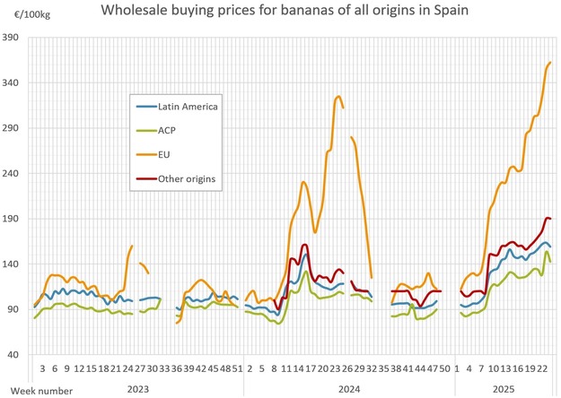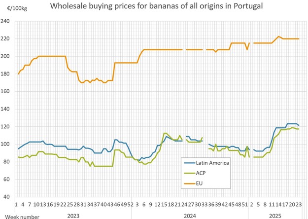 En revanche, la Roumanie (RO) a enregistré une légère augmentation des prix, les prix des bananes passant de 156 € à 158 € par 100 kg, ce qui maintient l'un des niveaux de prix les plus élevés de la région. La Slovaquie (SK) a enregistré une baisse de 153 € à 149 € par 100 kg, poursuivant ainsi une légère tendance à la baisse. Ces changements d'une semaine à l'autre mettent en évidence les différentes dynamiques de l'offre et de la demande qui affectent les prix des bananes sur les différents marchés de gros européens.