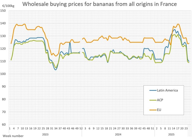 Au cours de la semaine s'achevant le 15 juin 2025 (semaine 24), les prix de gros des bananes dans plusieurs pays européens ont évolué de manière contrastée par rapport à la semaine précédente (s'achevant le 8 juin 2025). Selon les dernières données, la Lettonie (LV) a enregistré une légère augmentation des prix, les prix de gros moyens passant de 100 € à 101 € par 100 kilogrammes. Bien que modeste, ce changement indique une certaine stabilité des prix sur le marché letton.