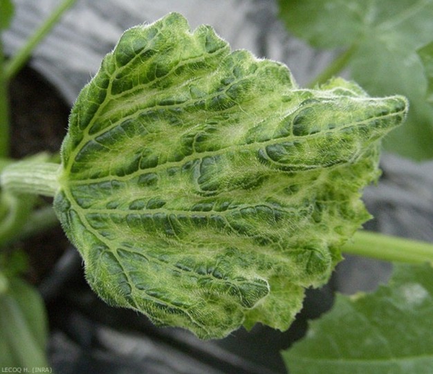 Le ToLCNDV se propage rapidement et peut causer des dégâts considérables sur les cultures. Il provoque des feuilles enroulées et recroquevillées, un gonflement des nervures, des mosaïques jaunes, des plantes chétives ainsi qu'une mauvaise nouaison / Sur la photo : ToLCNDV sur feuille de courgette