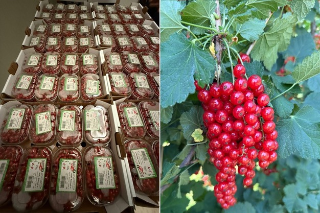 À gauche : des groseilles emballées pour le commerce de détail autrichien. Les fruits sont proposés en barquettes de 250 g chez les distributeurs à gamme complète, tandis que les discounters privilégient les formats de 500 g/À droite : groseilles fraîchement récoltées