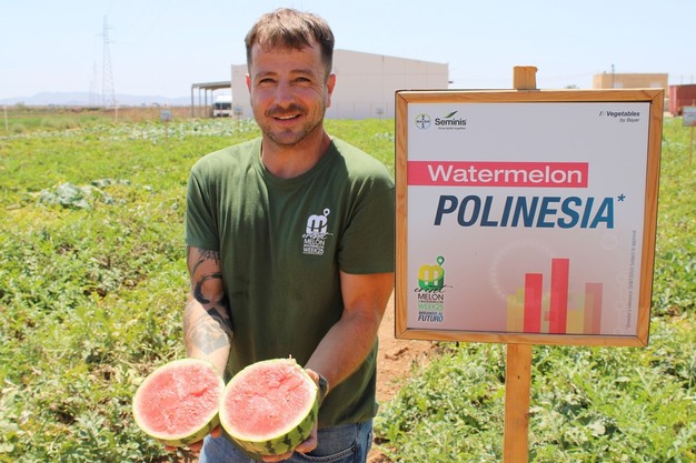 Dans la course aux nouveautés, José M.ª Román, technicien commercial de Seminis-Bayer, a présenté Polinesia, qui répond à « notre recherche d'un pollinisateur plus productif et à la chair plus ferme. » Le problème des récoltes de juillet et août est que, lorsqu'on coupe la pastèque triploïde, c'est-à-dire une pastèque sans pépins, le pollinisateur est déjà trop mûr et n'arrive pas dans les supermarchés ou chez le consommateur dans des conditions optimales. Pour remédier à cette situation, nous avons développé Polinesia, qui est le pollinisateur à la chair ferme et au cycle plus long, ainsi qu'à la forme plus ronde. D'autre part, elle retient les sucres et a une bonne saveur, ce qui la rend très attrayante pour le public. »