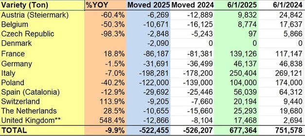 Au 1er juin 2025, les stocks de pommes dans les pays européens surveillés s'élevaient à 677 364 tonnes, soit une baisse de 9,9 % par rapport aux 751 578 tonnes enregistrées à la même date en 2024. Les baisses les plus importantes d'une année sur l'autre ont été observées en Pologne (moins 122 000 tonnes ou -40,2 %), en Italie (moins 198 281 tonnes ou -7,0 %), et en France (moins 86 187 tonnes malgré une augmentation de 18,8 % en pourcentage d'une année sur l'autre, en raison d'un mouvement plus important en 2025). L'Autriche, la Belgique et la République tchèque ont également connu de fortes réductions des volumes de stocks, l'Autriche chutant de 60,4 % et la République tchèque de 98,3 %.