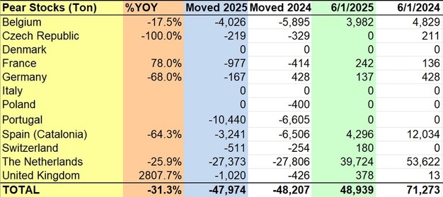 Les stocks européens de poires s'élevaient à 48 939 tonnes au 1er juin 2025, marquant une baisse de 31,3 % par rapport aux 71 273 tonnes enregistrées à la même date en 2024. D'importantes réductions d'une année sur l'autre ont été signalées en Espagne (Catalogne), où les stocks ont chuté de 12 034 tonnes à 4 296 tonnes (soit une baisse de 64,3 %), et aux Pays-Bas, où les stocks ont diminué de 13 898 tonnes à 39 724 tonnes, soit une baisse de 25,9 %. L'Allemagne a également enregistré une forte baisse de 68 %, les stocks passant de 428 tonnes en 2024 à 137 tonnes en 2025.