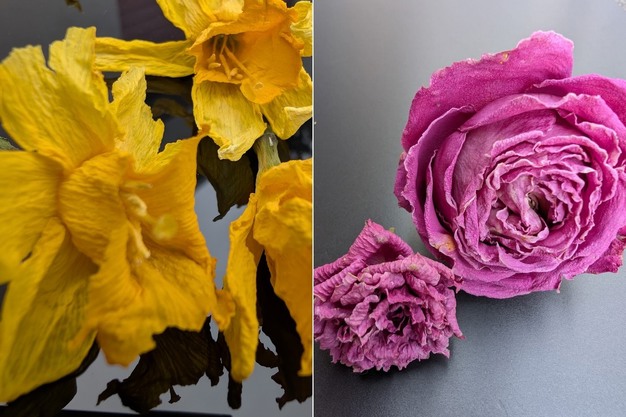 Fleurs séchées : jonquilles (à gauche) et roses