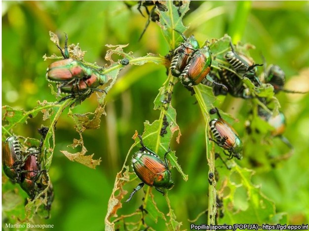 Le scarabée japonais est polyphage et donc susceptible de s'attaquer à de nombreuses plantes hôtes (arbres fruitiers, vignes, maïs, gazons, etc.) et d'occasionner des dégâts importants. Dans un avis de mai 2022, l'Anses alertait sur la menace du Popillia japonica, lequel se nourrit « sur un large spectre de plantes hôtes » incluant plus de 400 espèces.