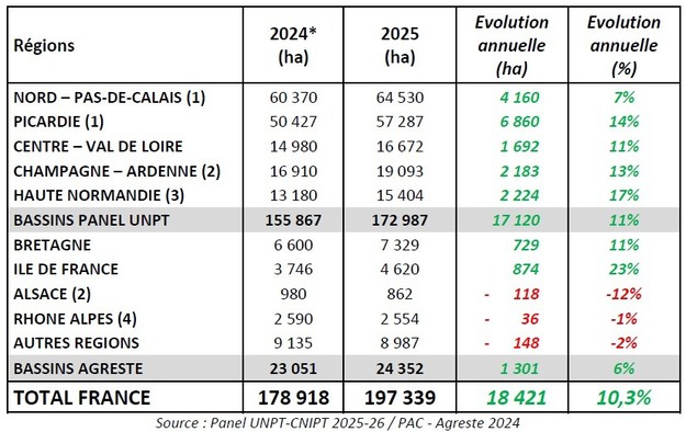 « Selon la première estimation tirée du panel de producteurs de l'Union Nationale des Producteurs de Pommes de Terre (UNPT) interrogé entre mai et fin juin 2025, dans les principales régions de production (Nord-Pas-de-Calais, Picardie, Centre-Val de Loire, Haute Normandie et Champagne-Ardenne), et complété par des données statistiques pour les autres bassins, les plantations en pommes de terre de conservation (frais & industrie) s'élèveraient à plus de 197 K ha en 2025 contre 178 K ha en 2024 (données PAC), soit une hausse de 10,3 % des surfaces (18 421 ha).