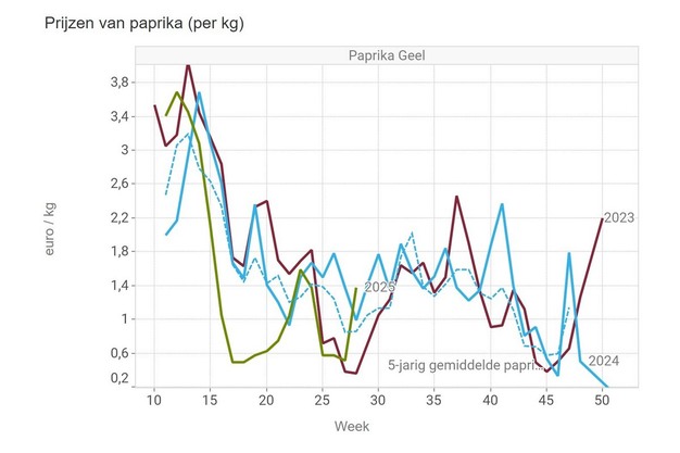 Pour les poivrons, une correction s'est produite la semaine dernière. Le prix du jaune a alors grimpé à 1,38 €/kg et celui du rouge a augmenté légèrement, pour atteindre 74 centimes d'€/kg. Dans l'ensemble, la hausse des prix du jaune et du rouge ramène le prix moyen du poivron à la moyenne quinquennale.