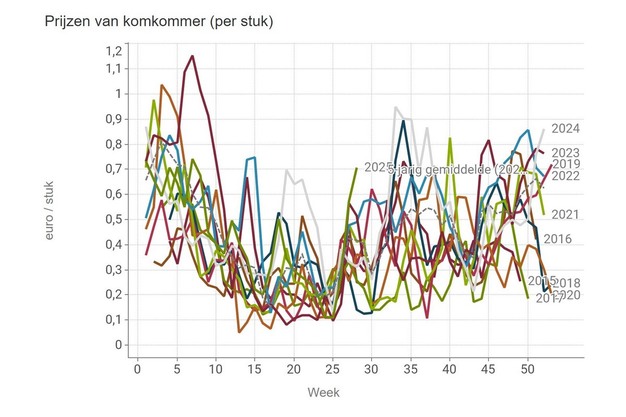 La semaine dernière, les prix des concombres ont grimpé en flèche. En semaine 28, sur le marché au cadran de la VBT, il s'élèvait à plus de 70 centimes d'€ l'unité. Un niveau de prix sans précédent pour cette période de l'année. Au cours des 10 dernières années, les prix des concombres n'ont pas dépassé les 50 centimes.