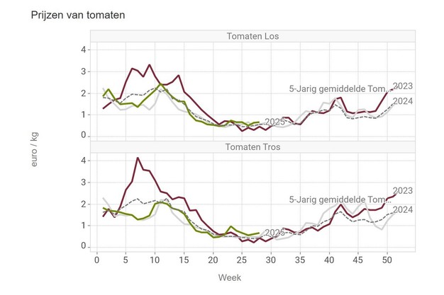 Le prix moyen des tomates rondes et en grappe a lui légèrement augmenté au cours de la semaine 28. Cela porte le prix moyen des grappes à plus de 67 centimes d'€/kg, et celui des rondes à plus de 68. Ces prix se situent à un niveau supérieur à la moyenne quinquennale et aux prix des deux dernières années.