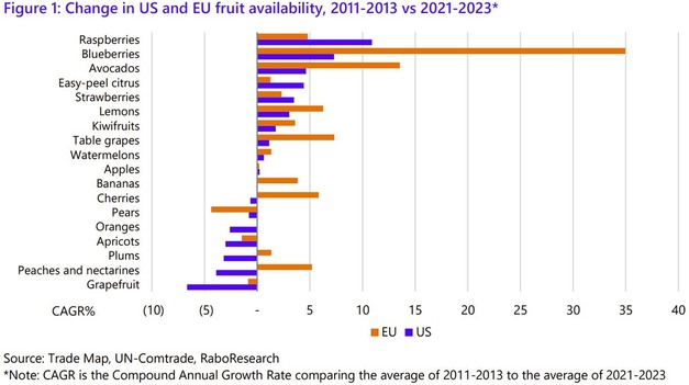 Les marchés mondiaux des fruits frais subissent des changements structurels, selon la dernière carte mondiale des fruits de Rabobank publiée en juillet 2025. Alors que de nombreuses tendances de l'édition 2018 se poursuivent, comme la forte demande de myrtilles et d'avocats et la domination des États-Unis et de l'Europe dans les importations de fruits, le rapport souligne de nouveaux changements induits par les conditions climatiques, les pressions sur les coûts et l'évolution des préférences des consommateurs.