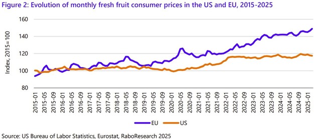 Les prix à la consommation des fruits frais ont fortement augmenté depuis 2020. En janvier 2025, les prix dans l'UE étaient 30 % plus élevés que cinq ans auparavant, tandis que les prix aux États-Unis ont augmenté de 19 %. Alors que les prix se sont stabilisés aux États-Unis après un pic en 2022, certains fruits transformés, en particulier le jus d'orange, ont connu des augmentations encore plus fortes. Les contrats à terme sur le jus d'orange concentré congelé ont augmenté de 370 % entre janvier 2020 et janvier 2025, en raison d'épidémies et de perturbations météorologiques au Brésil et en Floride.