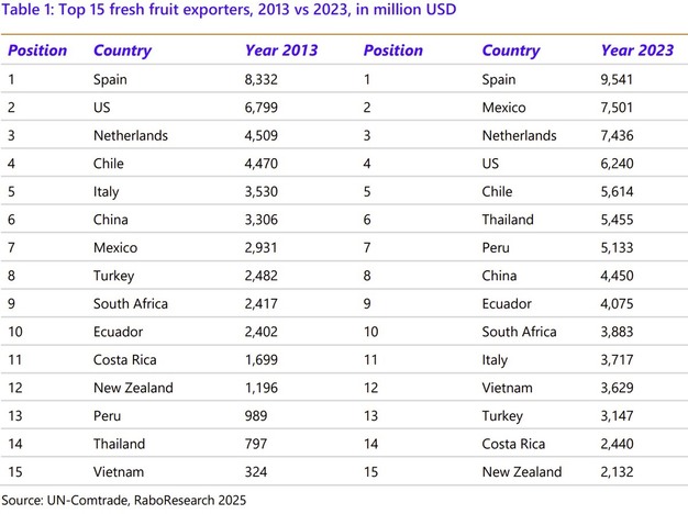 L'Amérique latine continue de consolider son rôle d'exportateur clé. Le Mexique s'est hissé à la deuxième place mondiale en termes de valeur des exportations, tandis que le Pérou et la Thaïlande se sont hissés respectivement à la septième et à la sixième place. Les États-Unis sont passés de la deuxième à la quatrième place au cours de la dernière décennie. L'Espagne reste le premier exportateur mondial, tandis que les Pays-Bas conservent leur rôle de plaque tournante des importations de l'UE. Bien que la production mondiale de fruits augmente à un taux annuel de 1,7 %, la production intérieure de l'UE et des États-Unis a diminué, ce qui accroît la dépendance à l'égard des importations, en particulier pour les fruits tropicaux et les produits hors saison.