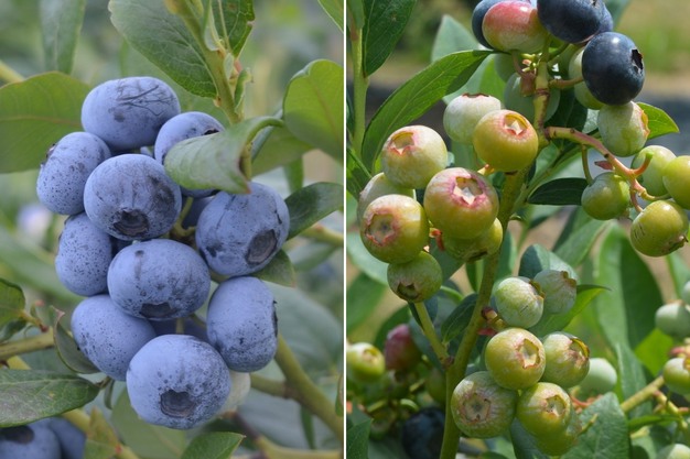 À gauche : de baies mûres. À droite : les brûlures se manifestent, entre autres, par des baies décolorées, qui pourraient toutefois se rétablir dans les semaines à venir