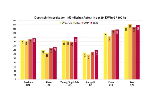 Selon le BLE, la demande générale est restée modérée, les acheteurs semblant se concentrer sur d'autres produits. Du côté des prix, la situation est restée stable, hormis les fluctuations habituelles. De manière générale, les prix des pommes se maintiennent cette année à un niveau relativement élevé, en raison de multiples facteurs.