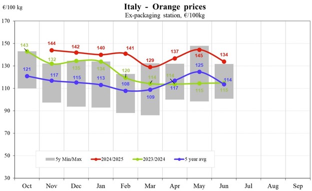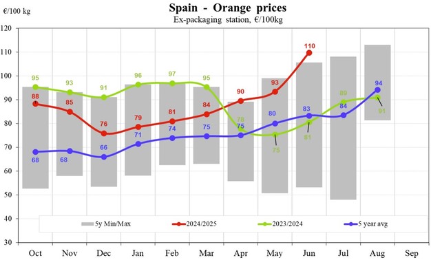 La Grèce a connu une évolution des prix plus modérée. En avril 2025, les oranges se vendaient à 72 €/100 kg, montant jusqu'à 82 € en mai avant de retomber à 72 € en juin. Malgré cette brève remontée, les prix sont restés proches des normes saisonnières et inférieurs aux sommets enregistrés en 2023/2024.