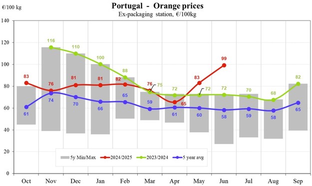 Au Portugal, les prix ont fortement augmenté au cours du printemps. De 65 €/100 kg en avril, ils sont passés à 83 € en mai, puis à 99 € en juin. Il s'agit d'une reprise notable par rapport aux chiffres de la saison dernière, ce qui place le Portugal parmi les meilleurs producteurs d'oranges de l'Europe du Sud cette année.