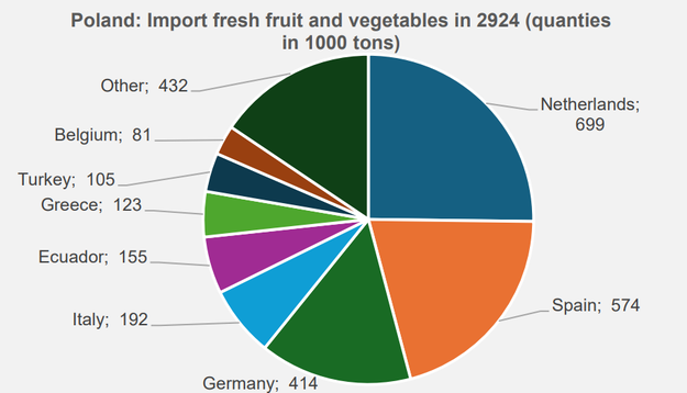 La Pologne importe beaucoup de fruits et légumes frais en provenance ou via les Pays-Bas. L'année dernière, 700 000 tonnes ont été importées depuis ce pays. C'est plus qu'en 2023 mais moins qu'en 2022. Trois produits dont les importations en provenance des Pays-Bas dépassent 100 000 tonnes en 2024 : les oignons, les bananes et les tomates. Les raisins, les oranges, les carottes, les avocats et les poires sont les suivants (avec 20 à 30 000 tonnes chacun). Les produits dont les importations sont inférieures à 20 000 tonnes sont les poivrons, les citrons, les mandarines et les pastèques.