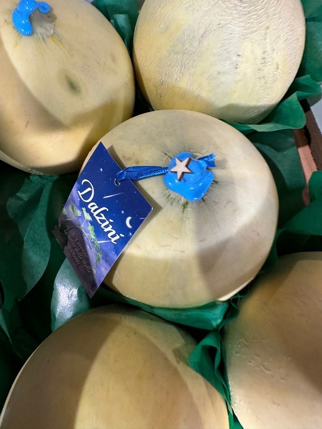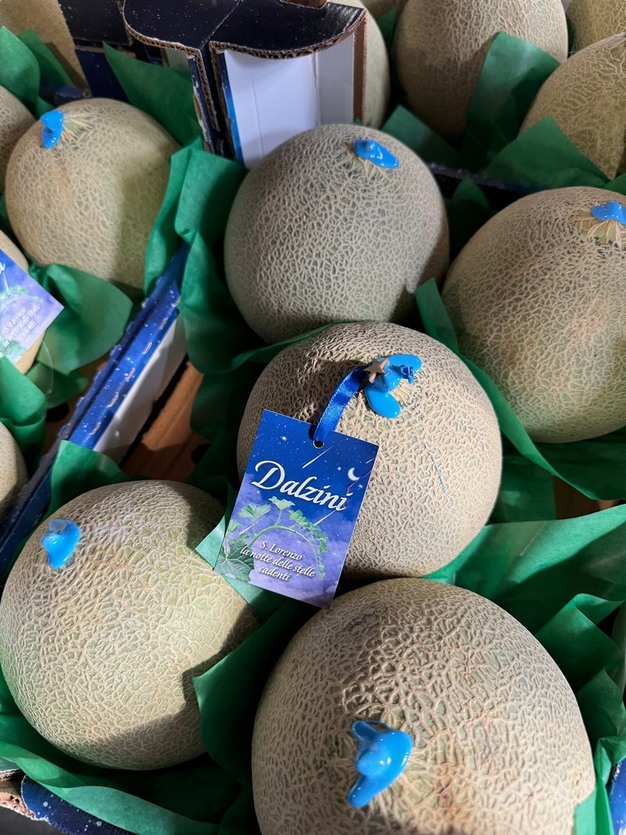 Le graphisme distinctif, qui évoque un ciel étoilé, est le résultat d'une année de travail et de conception. Outre l'esthétique, l'emballage comporte des détails qui racontent une histoire. Une phrase évocatrice, conçue personnellement par Luca Dalzini, est imprimée sur la facade des boîtes : 'En ces nuits où le ciel s'anime, chaque étoile est un rêve, un souhait et une promesse brillante'. Et l'inscription 'Édition limitée pour la semaine de San Lorenzo' est clairement visible. Sur le melon lui-même, se trouve une carte, également étoilée et portant la phrase et le nom de l'initiative, à savoir 'Les nuits de San Lorenzo', décorée d'une petite étoile en bois. Ces éléments renforcent le lien émotionnel avec le client final, qui est très attiré par ce souci du détail.