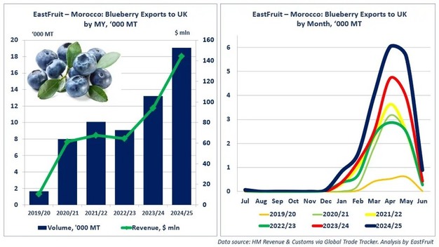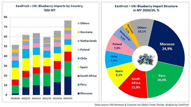 Le Royaume-Uni est désormais l'une des principales destinations des exportations de myrtilles du Maroc, après l'Espagne et les Pays-Bas. La saison marocaine s'étend de décembre à juin, avec un pic de volume en avril. Au cours de cette période, l'Espagne, les Pays-Bas et l'Allemagne ont été les principaux concurrents du Maroc sur le marché britannique.