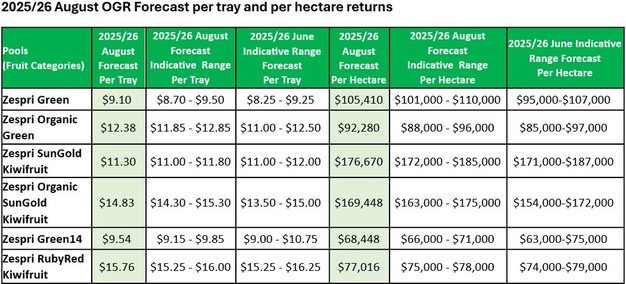 Zespri a publié ses premières prévisions complètes pour la saison 2025/26, indiquant des revenus record par hectare pour la plupart des catégories de kiwis, à l'exception de SunGold et Organic Green.