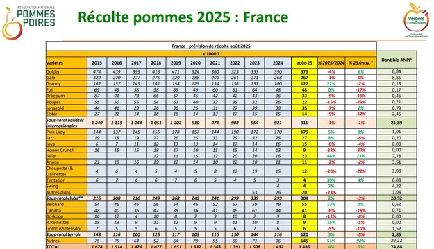 En pomme, la prévision nationale atteint 1,485 million de tonnes, soit une progression de +4 % par rapport à 2024 et de +3 % par rapport à la moyenne quinquennale. Une production « légèrement supérieure à la moyenne sans être pléthorique », précise Vincent Guérin, en charge des affaires économiques à l'ANPP, précisant que les prévisions sont susceptibles d'évoluer du fait de la pression du puceron cendré, très forte cette année. Dans le détail, Golden se situe au-dessus de la moyenne mais en léger retrait par rapport à l'an passé ; Gala retrouve un niveau normal, tout comme la Granny Smith après un creux l'an dernier. Les variétés internationales, elles, sont stables (-1 %). Les variétés Club* (Jazz, Pink Lady, etc.) poursuivent leur progression (+2 % à 300 000 t) grâce aux nouveaux vergers. Enfin, les variétés dites de terroir affichent des résultats contrastés : Belchard® Chantecler est conforme à la moyenne, meilleure récolte qu'en 2024, tandis que la Canada reste plus faible.