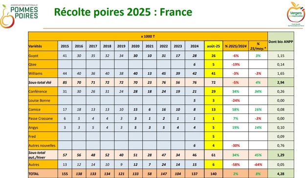 Pour la campagne 2025-2026 l'ANPP annonce une prévision de 140 000 tonnes de poires, un niveau « satisfaisant », supérieur à la moyenne et légèrement en hausse par rapport à l'an dernier. Après une forte récolte en poires d'été en 2024 (et notamment sur la Guyot), 2025 inverse la tendance avec -5 % sur le segment été et une plus forte récolte en poire d'automne et d'hiver notamment avec la Conférence. À l'échelle européenne, la récolte est estimée à 1,786 million de tonnes, en hausse de 1 %. Mais la situation diffère selon les pays : l'Italie chute de 25 % (fort recul sur l'Abate), le Portugal reste loin de son potentiel, tandis que les Pays-Bas (+8 %) et la Belgique se redressent après un creux en 2024 et comme pour la France, la récolte de poires d'été est en baisse (-14 %).