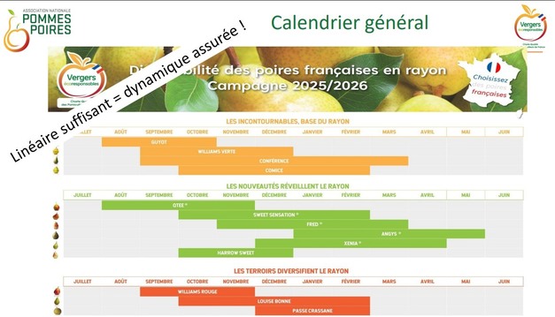 La production française, elle, reste marquée par une baisse régulière des rendements en raison des aléas climatiques et des difficultés techniques, mais près de 500 ha ont été plantés ces sept dernières années. C'est donc pour accompagner la diversification variétale et le développement du verger que l'ANPP travaille sur un partenariat avec l'aval. Un partenariat qui permettra également de dynamiser le rayon poire et qui prendra la forme d'un calendrier variétal « cohérent » avec l'origine France, « Une offre que nous sommes en capacité de servir jusqu'à fin janvier. L'objectif ici étant d'essayer de bâtir avec les distributeurs, des opérations promotionnelles cohérentes avec le calendrier de production et améliorer l'identification origine France et du label Verger écoresponsable », explique Vincent Guérin. En pratique il s'agira d'assurer une présence régulière en rayon de 2 variétés classiques combinées à 2 autres variétés disponibles pour assurer une diversité au consommateur et ainsi renforcer la dynamique de consommation.