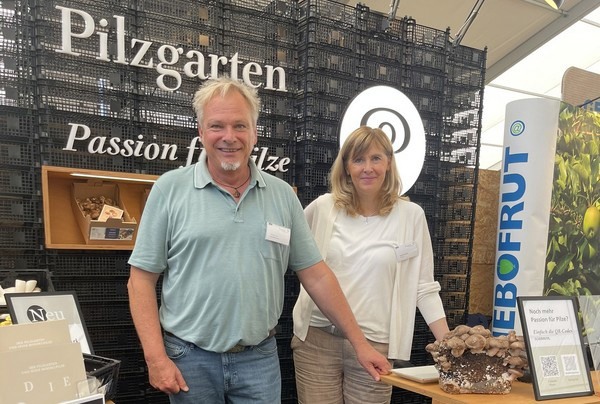 Torsten Jonas de la société Pilzgarten GmbH accompagné d'une collègue sur le stand de l'entreprise