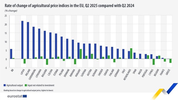 Les prix de la production agricole ont augmenté dans presque tous les pays de l'UE au deuxième trimestre 2025 par rapport au même trimestre de 2024, à l'exception de la Grèce. Les plus fortes hausses ont été enregistrées en Lettonie (+21,8%), en Irlande (+21,1%), et au Luxembourg (+18,4%). La Grèce a enregistré une légère baisse de 0,1% au cours de cette période.