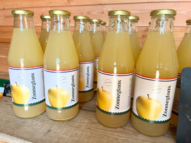« La particularité de Zonneglans est qu'elle ne se décolore pas après avoir été coupée, ce qui la rend idéale pour les salades. Son goût est rafraîchissant et sucré, avec un arôme d'agrumes. De plus, cette pomme convient également aux personnes allergiques aux pommes. Nous avons été surpris de constater le nombre de personnes qui en souffrent, même dans notre région. Ils viennent de loin pour l'acheter ! Et les pommes déclassées sont pressées par Schulp dans des bouteilles portant notre propre étiquette. »