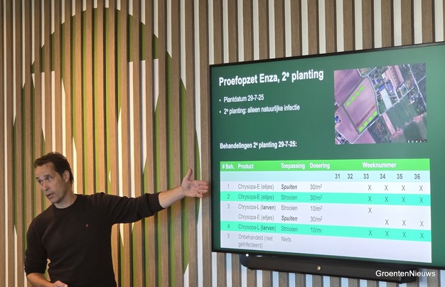 Pascal Staaks a présenté, au nom de Koppert, les résultats de la recherche sur la culture de la laitue iceberg. Les spécialistes de la lutte biologique utilisent la chrysope Crysopha carnea, pour lutter contre les pucerons. Il est clair que les cultures en plein air ne sont pas encore aussi avancées que celles sous serre en ce qui concerne le déploiement d'agents de contrôle biologique. Parmi les défis à relever, citons la recherche de la bonne technique de pulvérisation, la combinaison avec d'autres produits de protection des cultures et le fait que les agents de contrôle biologique sont également des insectes que les consommateurs ne veulent pas trouver dans les salades...