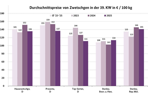 Selon le BLE, la saison touche à sa fin et la disponibilité s'est nettement réduite. Les prunes et pruneaux indigènes (notamment la Presenta, les pruneaux domestiques et diverses variétés de premier choix) ont occupé le devant de la scène aux côtés de la Stanley d'Europe de l'Est. Dans l'ensemble, la qualité est restée satisfaisante. À Hambourg, des conditions météorologiques favorables ont facilité le stockage, permettant aux négociants d'augmenter légèrement leurs volumes mis en vente.