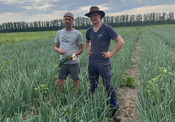 Frederic Goldkorn et Sebastian Klass - récolte d'oignons à la ferme bio Klass