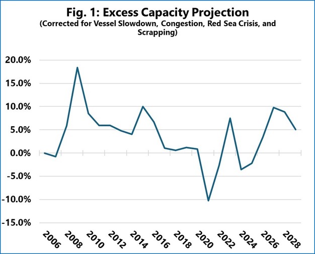 Selon le modèle corrigé, le marché devrait passer de la récente période de pénurie de capacités à une surcapacité prononcée. Cette offre excédentaire devrait culminer en 2027, mais dans une moindre mesure que lors de la crise financière de 2009. Les prévisions supposent que la crise de la mer Rouge sera résolue d'ici la mi-2026, ce qui remettrait une quantité substantielle de capacité sur le marché.