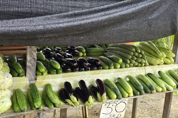 Parmi les choux, nous retrouvons non seulement le chou pommé et le chou-fleur, mais aussi plusieurs variétés chinoises telles que l'amsoi, le kailan, le kaisoi et le pak choi. Outre les haricots verts, une légumineuse pouvant atteindre 1 mètre de long est également cultivée au Suriname : le haricot long. Originaire d'Asie de l'Est, ce légume est légèrement plus sucré et plus épicé.