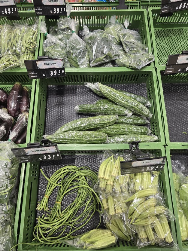 Au Suriname, la famille des Cucurbitacées ne se compose pas seulement de cornichons et de concombres, mais aussi de sopropo ou melon amer, un fruit à la peau verruqueuse originaire d'Asie et d'Afrique qui est récolté vert et consommé cuit. Le gombo épicé est également un légume-fruit, un légume d'origine africaine qui ressemble quelque peu à un poivron vert, mais qui appartient à une toute autre famille.