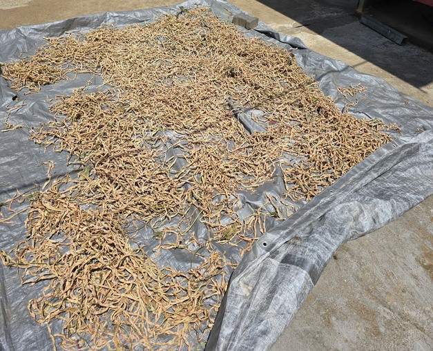 Les haricots longs sont mis à sécher pour en extraire les graines pour la prochaine récolte