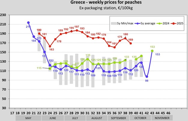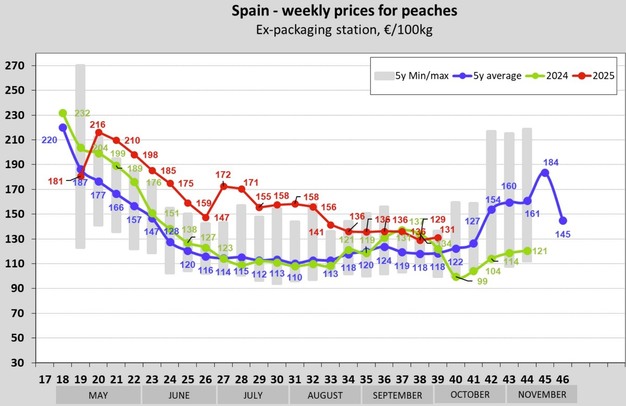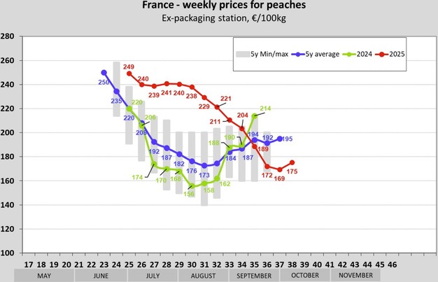 Les prix des pêches en Europe ont connu des tendances variées au cours des semaines 37 à 39 de la campagne 2025. En Espagne, les prix enregistrés lors de la semaine 37 étaient de 136 €/100 kg, chutant encore à 129 € lors de la semaine 38, avant de remonter légèrement à 131 € lors de la semaine 39. Ils se situent ainsi en dessous de la moyenne quinquennale, ce qui confirme la pression exercée sur les rendements par rapport à l'année dernière.