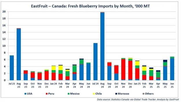 Les exportateurs marocains de myrtilles ont augmenté leurs expéditions vers le Canada entre juillet 2024 et juin 2025. Selon EastFruit, le Maroc a exporté 1 900 tonnes de myrtilles pour une valeur de plus de 19 millions de dollars US. C'est presque le double du volume de la saison précédente et environ 17 fois plus qu'il y a trois saisons. Le taux de croissance annuel moyen au cours de cette période a atteint près de 160 %.