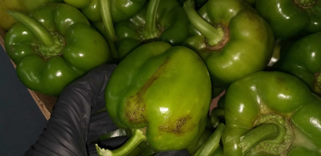 « Cela n'est malheureusement pas valable que pour les plantes, mais aussi pour les insectes indésirables, dont la liste continue de s'allonger. Cet hiver, nous allons connaître de gros soucis avec le Thrips parvispinus. Les producteurs ne savent déjà plus où donner de la tête ! Il n'y a pas encore de solution, ces thrips vivent sur les feuilles, et chaque poivron qui entre en contact avec une feuille se retrouve endommagé (voir la photo ci-dessous). »