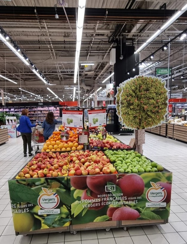 En parallèle de cette campagne TV, des actions en magasin sont menées : « Nous venons de terminer la 1ère vague de visites de nos promoteurs dans 550 magasins qui ont eu lieu entre mi-septembre et mi-octobre. Ces promoteurs rencontrent les chefs de rayon, présentent la campagne, font des relevés de rayons mais aussi installent du matériel d'information et des théâtralisations des rayons afin de valoriser la gamme de pommes et de poires ». Les actions continuent, puisque des vagues d'animation commencent ce week-end jusqu'à fin novembre : « Nous allons avoir 230 journées d'animations dans les magasins jusqu'à la fin de l'année. Nous continuons également notre action sur les réseaux sociaux à la fois sur les comptes de Vergers Ecoresponsables et PommesPoiresdeFrance Facebook et Instagram) mais également via la collaboration avec des influenceurs, notamment à travers des communautés où les abonnés se rassemblent autour de la cuisine ».