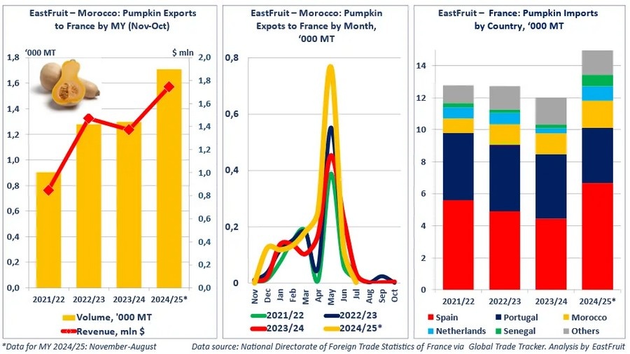 Le Maroc s'apprête à atteindre un nouveau record saisonnier pour les exportations de courges vers la France, marquant ainsi sa troisième année consécutive de croissance, selon EastFruit. Entre novembre 2024 et août 2025, les exportateurs marocains ont expédié près de 1 700 tonnes métriques de courges pour une valeur de 1,75 million de dollars US. Ce volume représente une augmentation de 32 % par rapport à la saison précédente et est presque le double du total de 2022/23, établissant un nouveau record dans les échanges entre les deux pays.