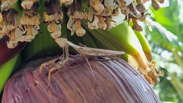 © Johan van der WaalsMantes sur une fleur de bananier à Canterbury Estates, Eswatini