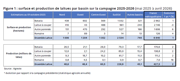 La production française de laitues atteindrait 427,5 millions de têtes pour la campagne 2025-2026 (selon les prévisions arrêtées au 1er octobre 2025), soit une hausse de 9 millions de têtes par rapport à la campagne précédente. En septembre les prix ont été supérieurs de 3 % à ceux de 2024, selon Agreste.