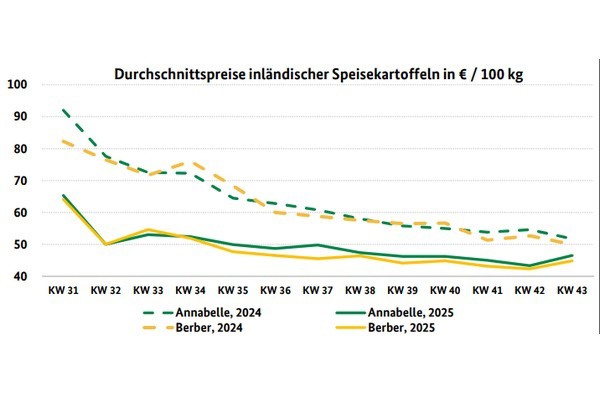 Sur le marché allemand, la situation de fond reste inchangée. La récolte est désormais terminée dans tout le pays, mais les régions excédentaires continuent de faire pression sur les prix des lots stockés. Dans le commerce de détail, on observe davantage d'emballages de 5 kg, mais ni les promotions ni les exportations n'insufflent de véritable dynamisme. Les entrepôts sont bien garnis, mais aucune hausse de prix n'est envisagée, même pour les lots de qualité supérieure.